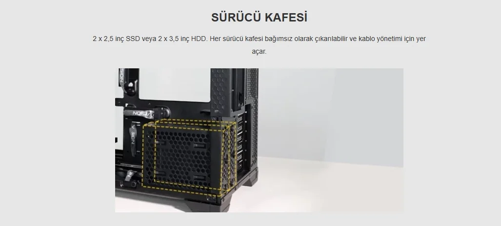 2 x 2,5 inç SSD veya 2 x 3,5 inç HDD. Her sürücü kafesi bağımsız olarak çıkarılabilir ve kablo yönetimi için yer açar.