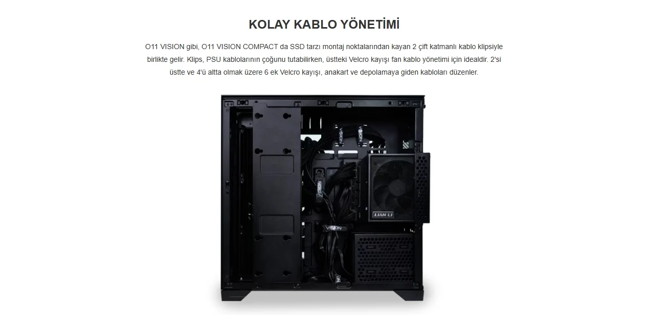 O11 VISION gibi, O11 VISION COMPACT da SSD tarzı montaj noktalarından kayan 2 çift katmanlı kablo klipsiyle birlikte gelir. Klips, PSU kablolarının çoğunu tutabilirken, üstteki Velcro kayışı fan kablo yönetimi için idealdir. 2'si üstte ve 4'ü altta olmak üzere 6 ek Velcro kayışı, anakart ve depolamaya giden kabloları düzenler.