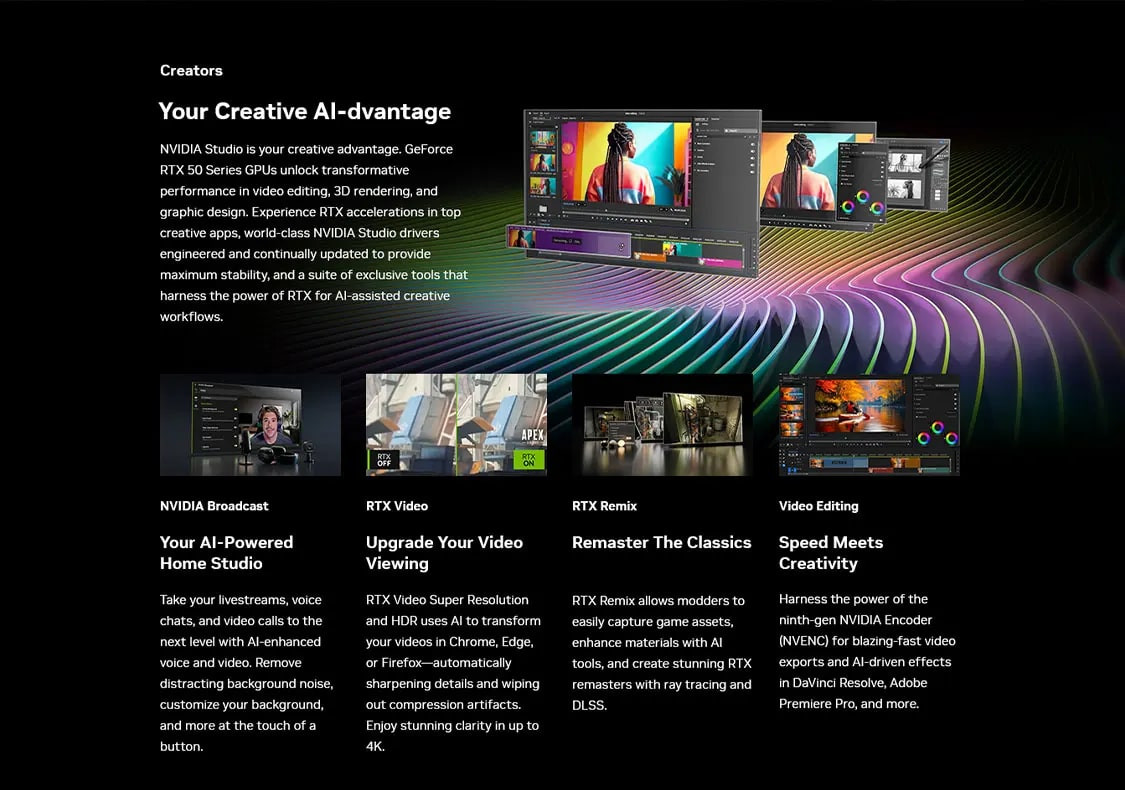 NVIDIA Studio sizin yaratıcı avantajınızdır. GeForce RTX 50 Serisi GPU'lar video düzenlemede dönüştürücü performansın kilidini açar. 3D render ve grafik tasarım. En iyi yaratıcı uygulamalarda RTX hızlandırıcıları, maksimum kararlılık sağlamak için tasarlanan ve sürekli güncellenen birinci sınıf NVIDIA Studio sürücüleri ve AU destekli yaratıcı iş akışları için RTX'in gücünü kullanan özel araçlar paketini deneyimleyin.