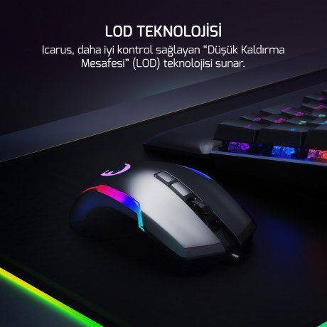ICARUS, FPS oyunları ve küçük mousepad kullanıcıları için faydalı olan ve daha iyi kontrol sağlayan düşük Kaldırma Mesafesi (LOD) teknolojisi sunar.